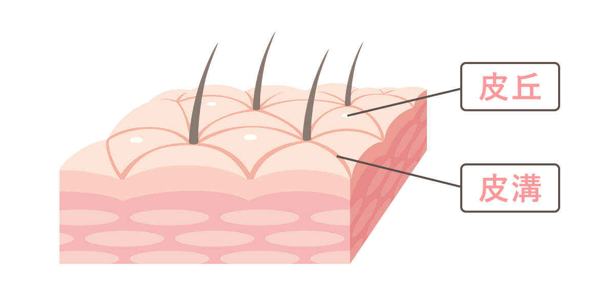 本来のすこやかな肌表面では角質が細かな凹凸を形づくっており、凸の部分を皮丘(ひきゅう)、凹の部分を皮溝(ひこう)と呼びます。この皮丘と皮溝が規則正しく整列している状態を「キメがそろっている」といいますが、肌荒れが起こった肌表面では皮丘や皮溝の整列が乱れ、キメがそろわない状態になっているのです。