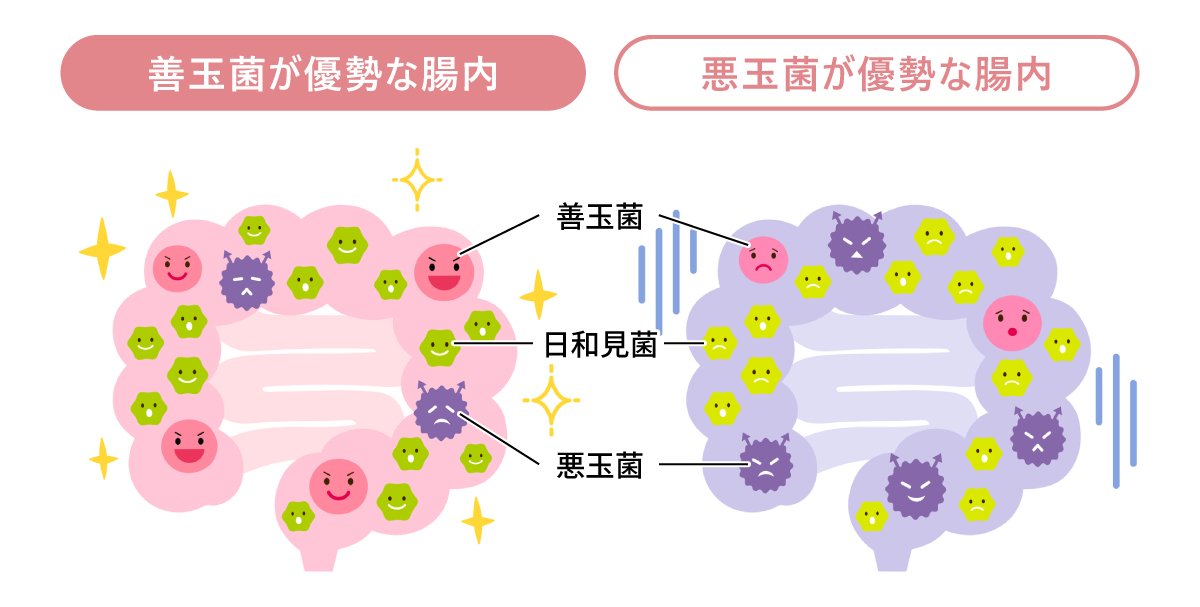 腸内では、善玉菌、悪玉菌、日和見菌が種類ごとにグループを作るようにして存在し、バランスを保っています。善玉菌が優勢な腸内では、乳酸菌や酢酸菌などが酪酸や酢酸を産生し、腸内環境を酸性にします。酸性の腸内環境では、腸壁を守る粘膜や粘液が正常に働き、健康な状態が保たれるのです。