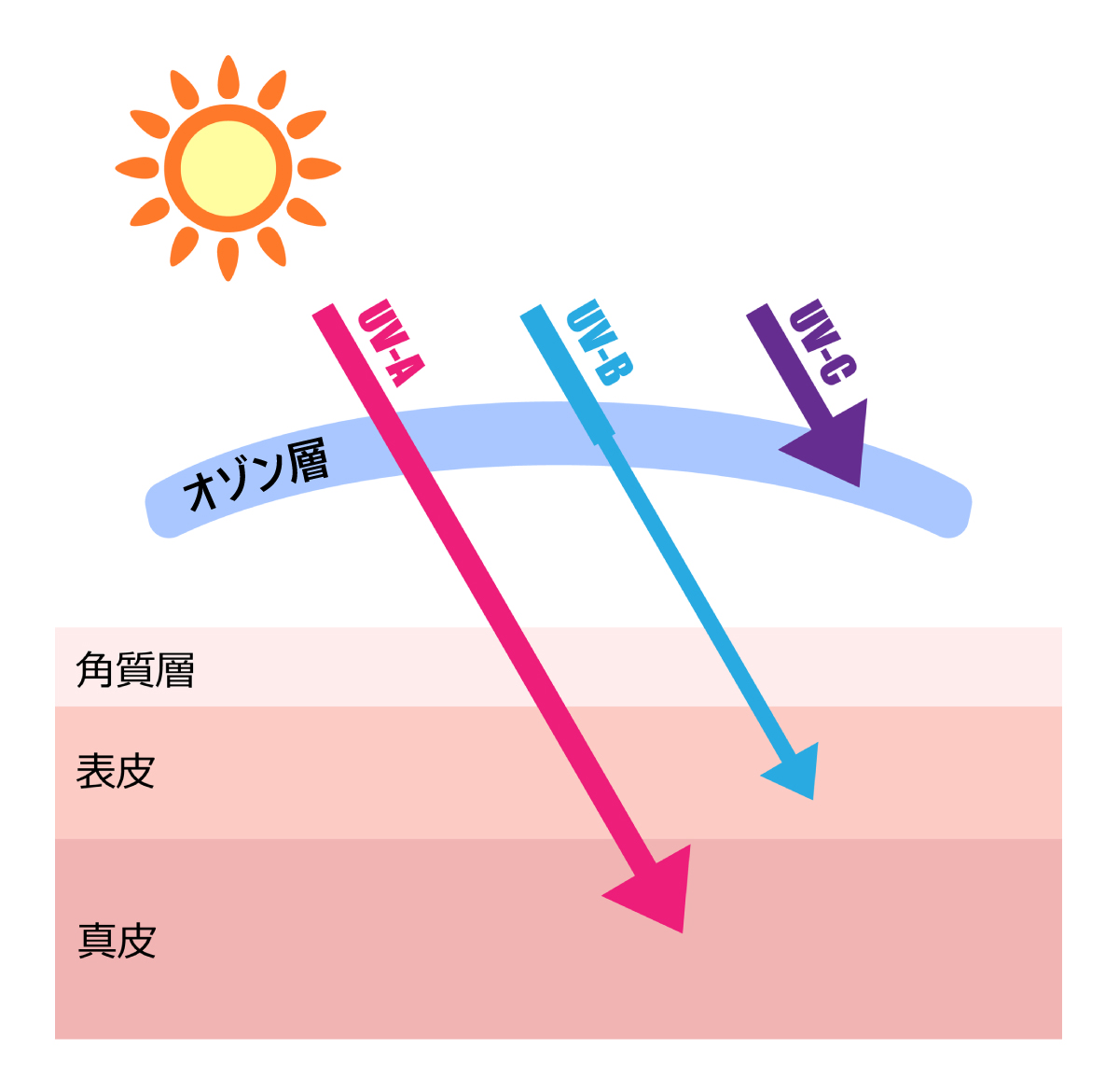 紫外線には、真皮まで届くUV-Aや、表皮にダメージを与えるUV-B、オゾン層に遮られて地表に届かないUV-Cといった種類があります。