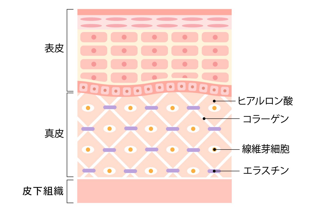 肌は表皮・真皮・皮下組織の3層構造になっており、特に真皮がハリの中心的役割を担っています。