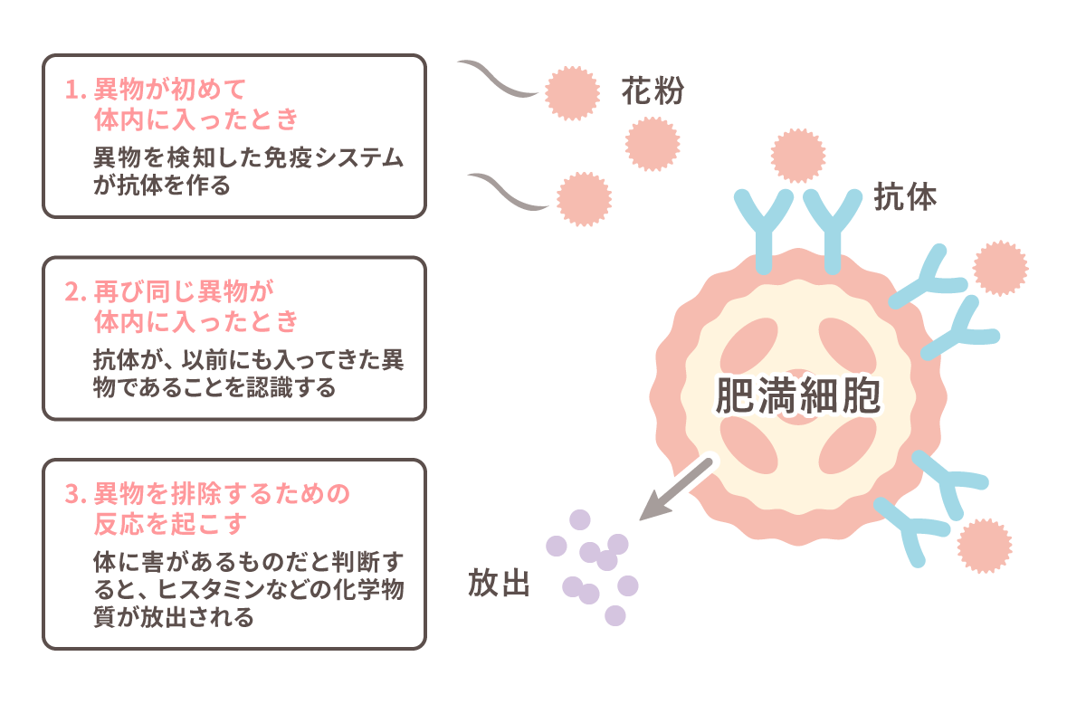再び同じ異物が侵入するとこの抗体が働き、以前にも入ってきた異物であることを認識します。そこで、体に害があるものだと判断すると、ヒスタミンなどの化学物質が放出され、異物を排除するための反応が起こります。ヒスタミンは、不快感を引き起こす原因物質のひとつです。