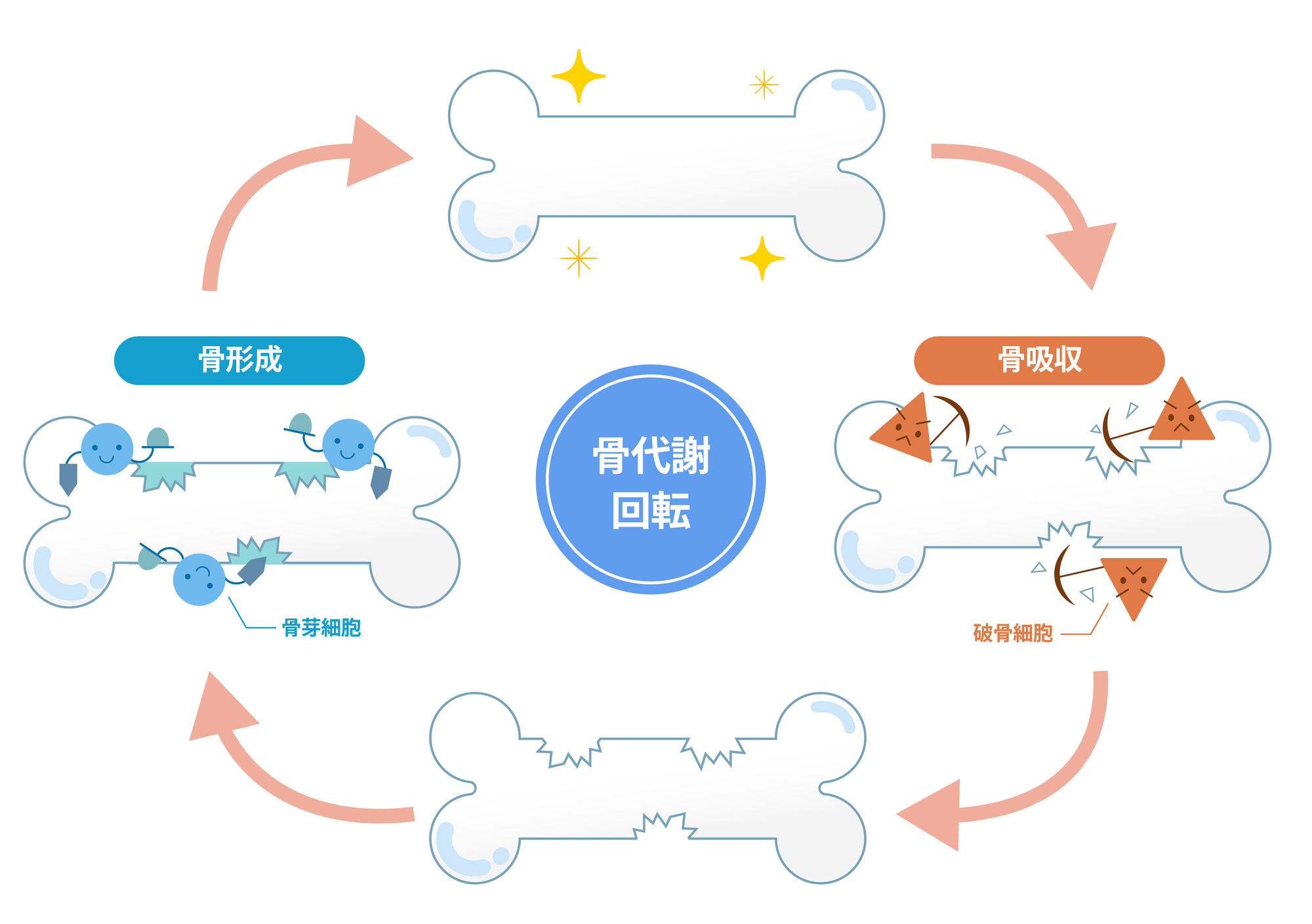 骨(こつ)細胞は、古くなったものが新しいものに入れ替わることで常に生まれ変わっています。具体的には、破骨(はこつ)細胞が古くなった骨細胞を溶かして吸収することを骨吸収、骨芽(こつが)細胞が新しい骨細胞を作ることを骨形成といい、骨吸収と骨形成のサイクルを骨代謝回転といいます。骨形成にはカルシウムとビタミンDが必要ですが、これらが不足すると骨吸収のスピードに骨形成が追いつかず、骨密度の低下や骨粗しょう症のリスクが高まります。