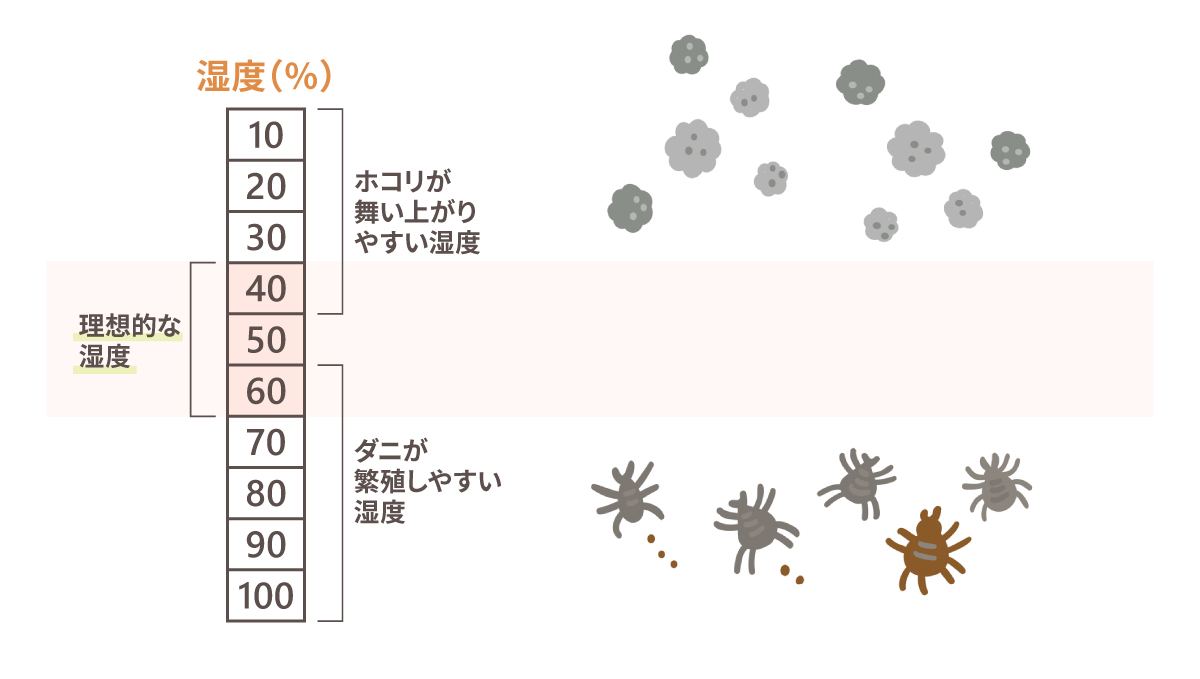ハウスダストに含まれるダニは、温度25~30℃、湿度60%以上で繁殖しやすいといわれます。一方で、湿度が40%を下回って乾燥しすぎると、ホコリが非常に舞い上がりやすくなります。加湿器と除湿機を使い分け、年間を通して湿度40~60%を目安にキープしましょう。