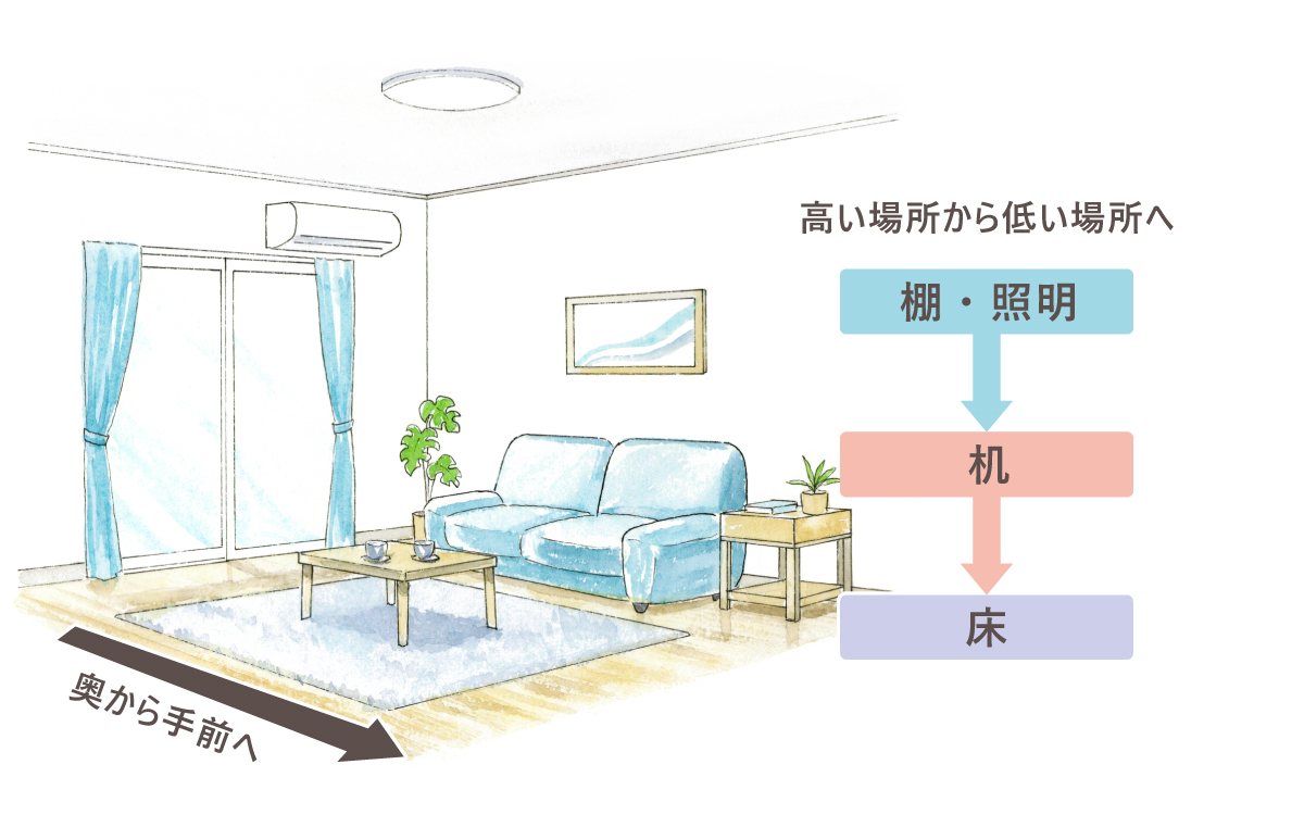 効率良くハウスダストを除去するためには、掃除の手順も重要です。基本は「高い場所から低い場所へ」です。まず棚の上や照明器具、カーテンレールなどの高い場所にあるホコリを落とし、次に机などを掃除して、最後に床を仕上げることで、二度手間を防ぎながら部屋全体を清潔に保てます。