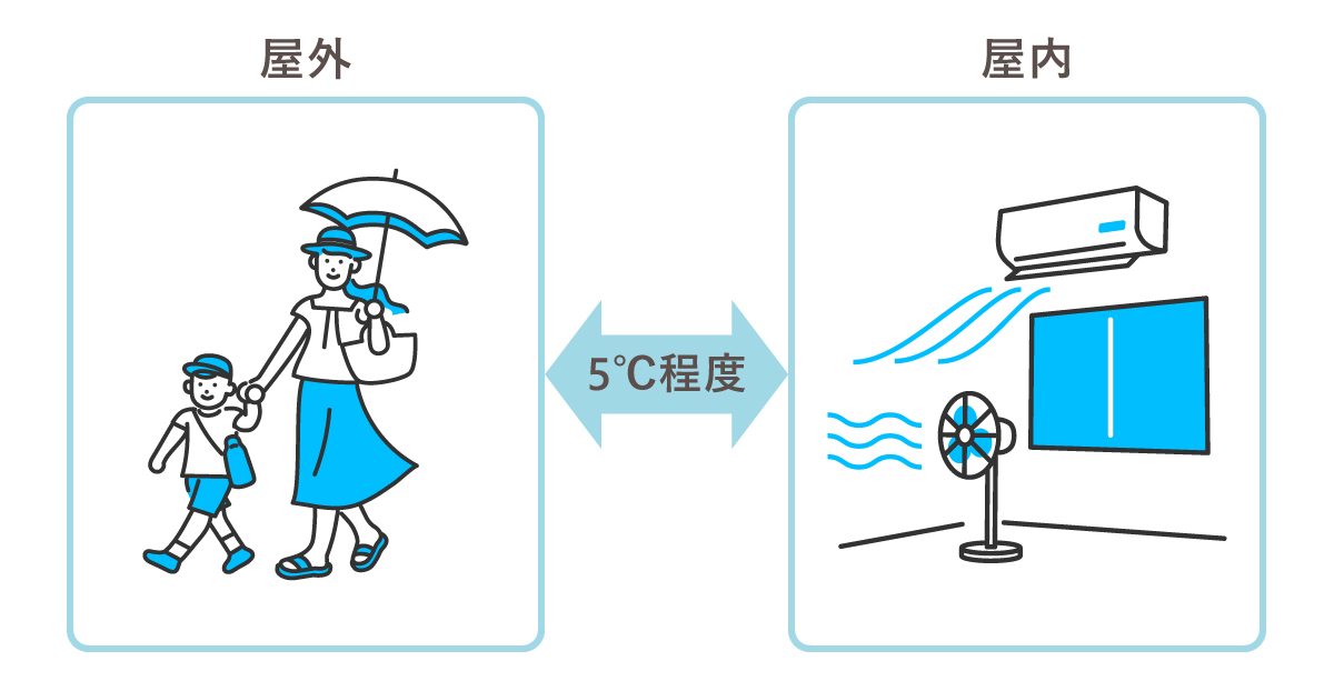 寒暖差疲労を抑えるには、屋外と室内の温度差をできるだけ小さくすることが大切です。目安として、冷房の設定温度と外気温との差ができるだけ5℃程度になるよう意識してみてください。