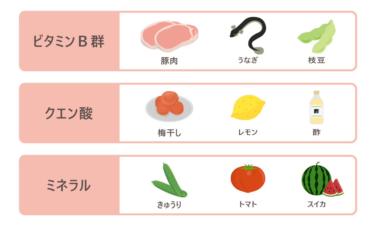 夏の食事には、疲労回復に役立つビタミンB群やクエン酸、ミネラルなどの栄養素を意識して摂取するとよいでしょう。これらの栄養素を摂取するには、以下のような食材がおすすめです。